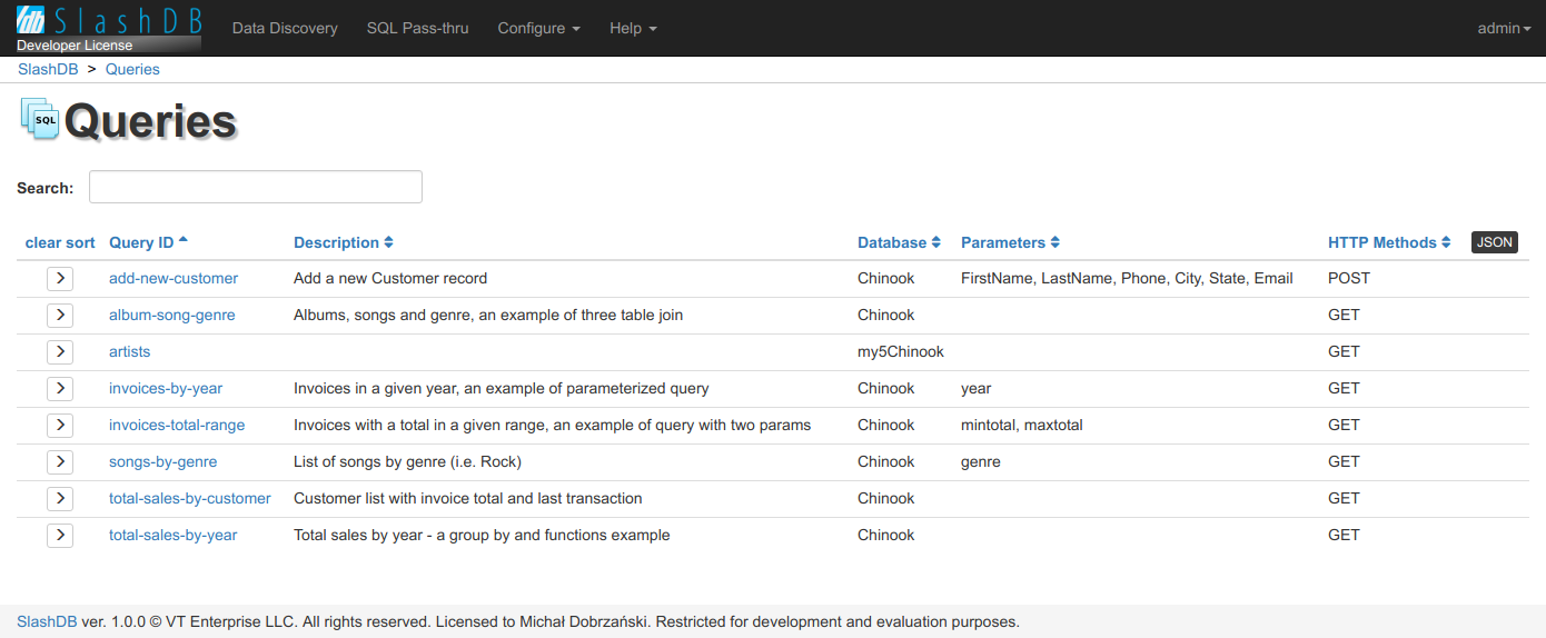 button in the top right corner of the table is a link to the list of executable queries in JSON format.